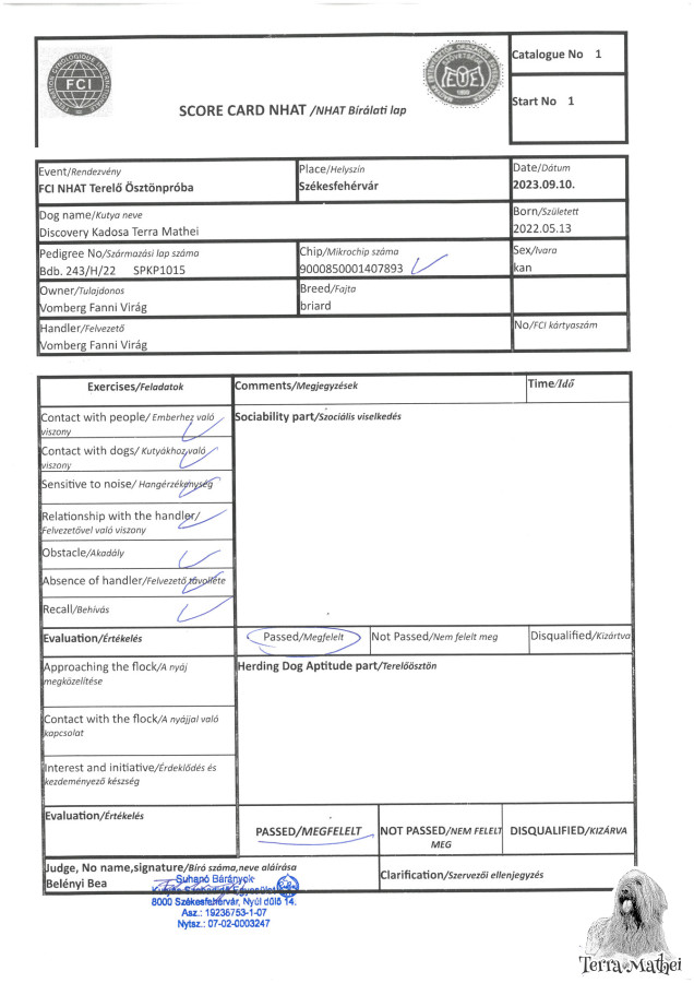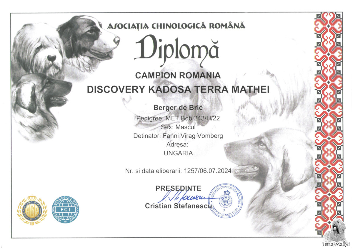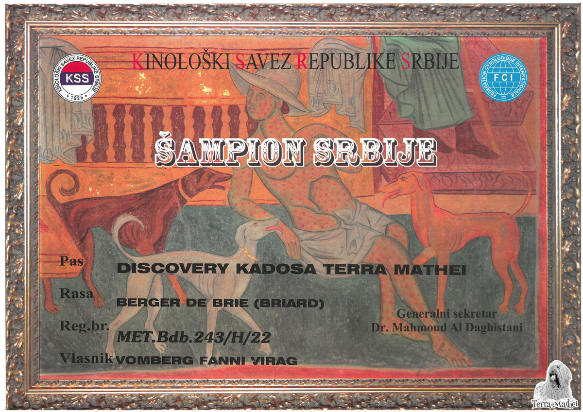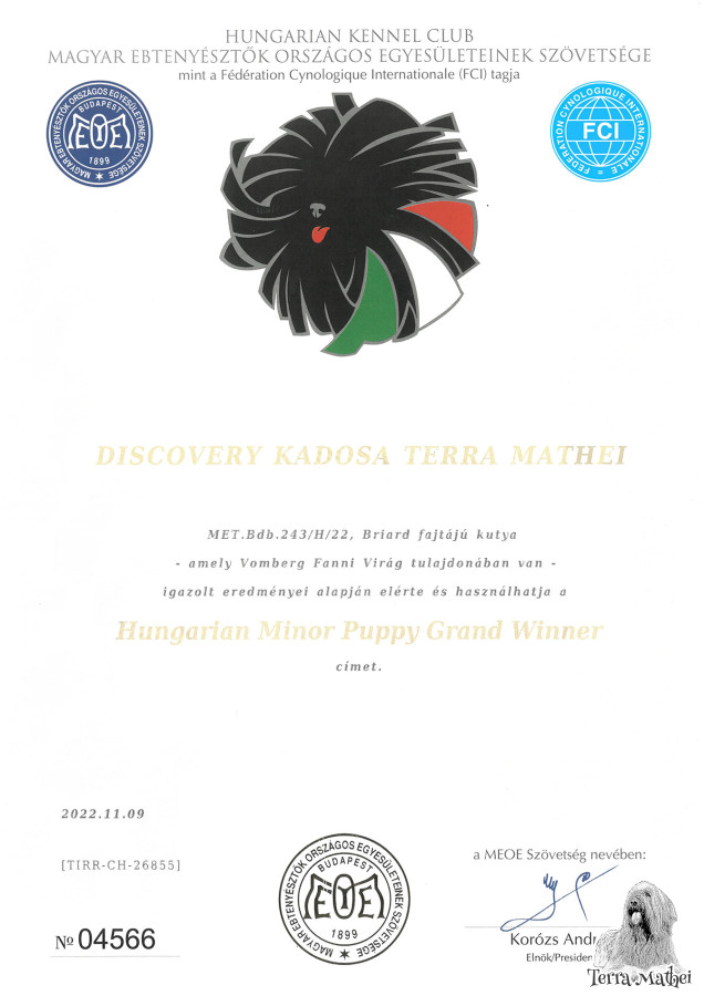 Title: Champion Romania, Junior International Champion, Slovakian Junior Champion, Serbian Junior Champion, Hungarian Junior Champion, Junior Club Winner, Junior BIS Winner, Hungarian Minor Puppy Grand Winner, Baby Club Winner, Baby BIS Winner, Hungarian Puppy Grand Winner, Serbian Champion, Hungarian Show Champion